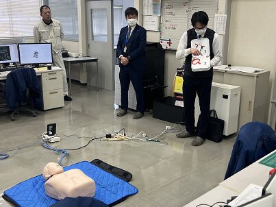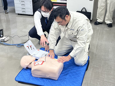 今回の講習では、心肺蘇生法とAED使用の流れとして、昨年弊社でも導入いたしました「オートショックAED」の操作と胸骨圧迫を体験しました 。AEDが自動で電気ショックの要否を判断してくれるため、初めて触れる社員さんからも「これならいざという時に迷わず使えそう」という声が上がりました 。胸骨圧迫についても体重をかけてしっかり圧迫する必要があるため、苦戦する社員さんが多く見られました。